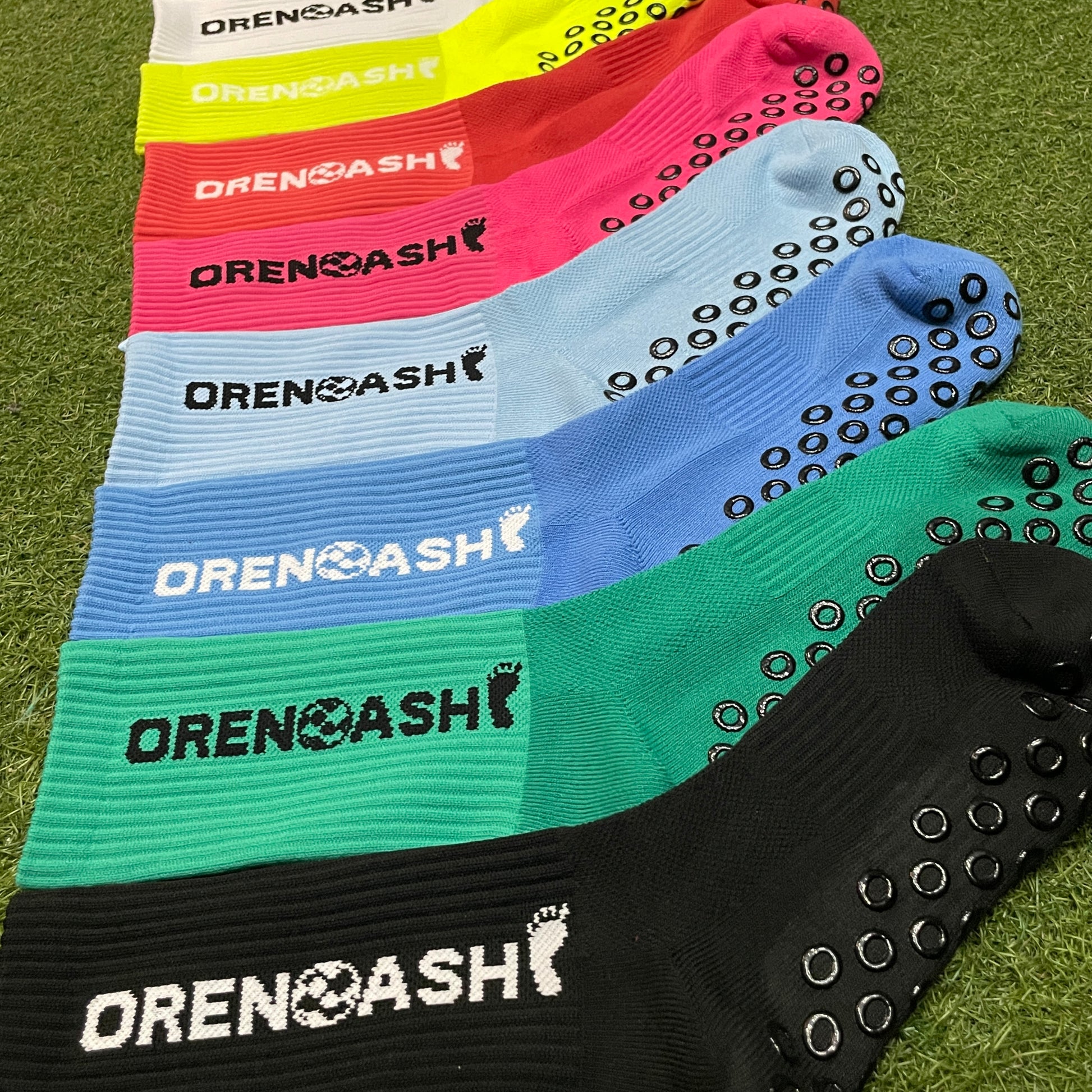 ロゴ→ORENOASHI の🦶部分のみ編み込み部分を伸ばしくるぶしの履き心地を安定させています。