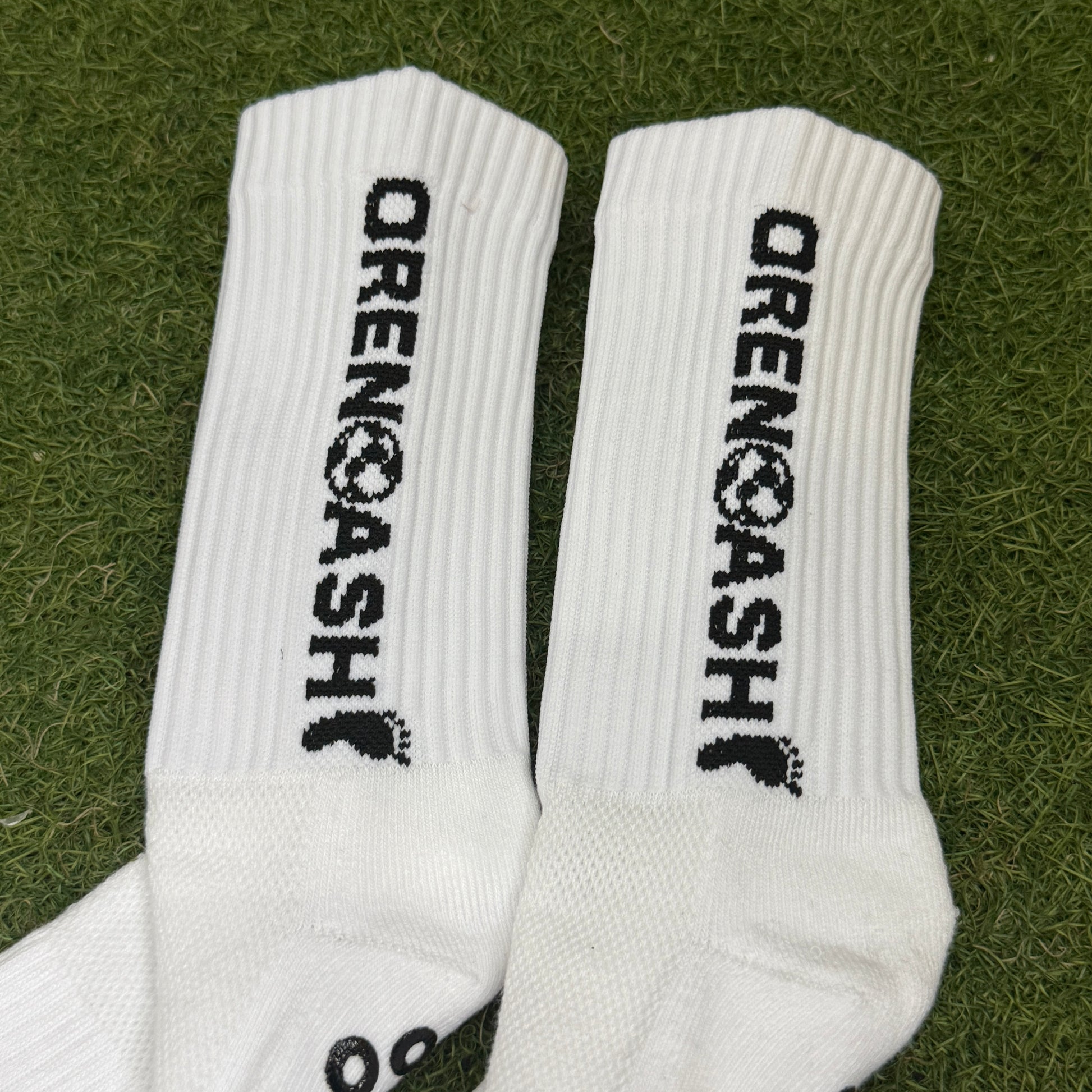ロゴ→ORENOASHI の🦶部分のみ編み込み部分を伸ばしくるぶしの履き心地を安定させています。